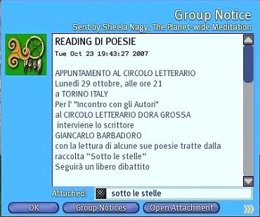 Lunedì 29 ottobre 2007, sul sito di Second Life "TORINO ITALY", al consueto appuntamento dell'Incontro con gli Autori organizzato dal Circolo Letterario "Dora Grossa", Giancarlo Barbadoro, il flautista e poeta del Laboratorio Musicale del Graal, a mezzo del suo avatar John Titor Shan, presenta il suo libro di poesie "Sotto le stelle". |