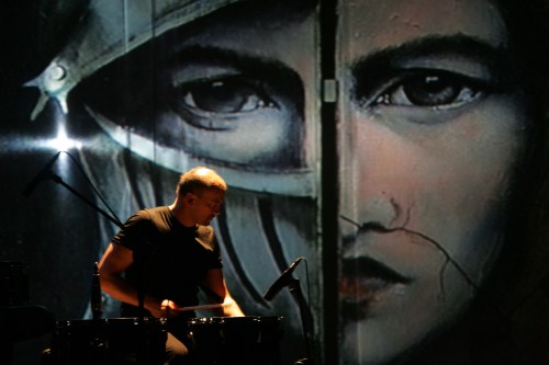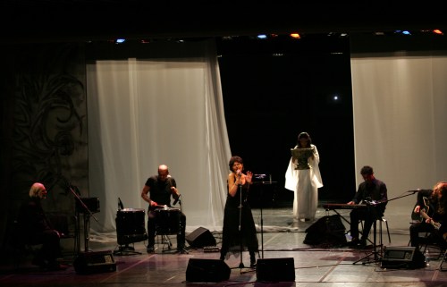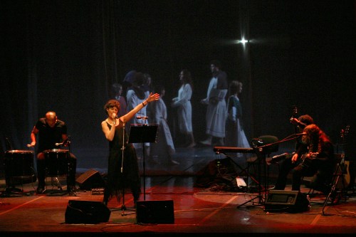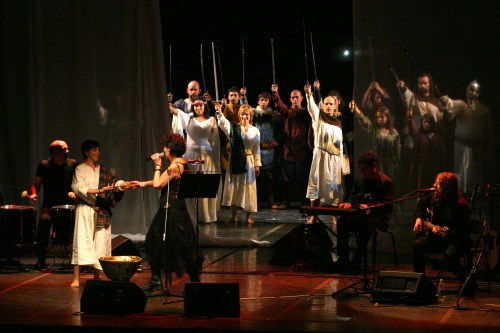 Un momento del concerto con la rappresentazione degli attori sullo sfondo