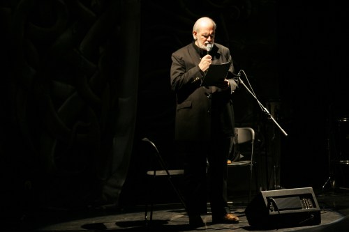 Giampiero Leo dopo aver presentato lo spettacolo consegna a Rosalba Nattero