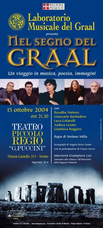 E' con vero piacere che presento lo spettacolo "Nel Segno del Graal", un prezioso lavoro di ricerca musicale e culturale attraverso un viaggio nelle inesplorate dimensioni dei miti celtici. Giampiero Leo Assessore alla Cultura e all'Istruzione della Regione Piemonte