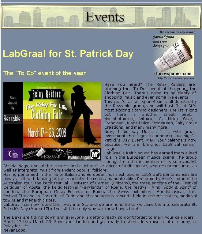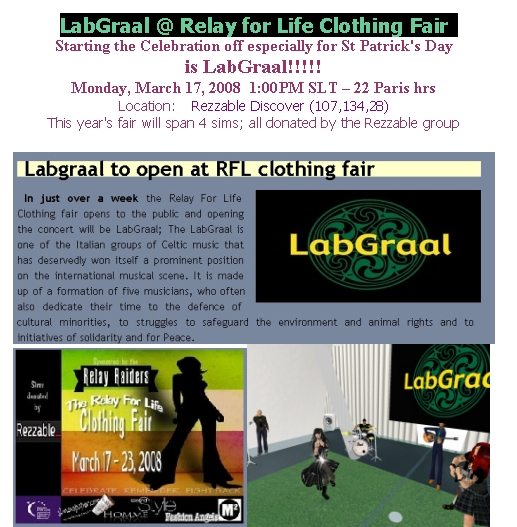 Il LabGraal si è esibito il 17 Marzo 2008 in occasione di St. Patrick's Day per "Relay For Life Clothing Fair", uno dei maggiori eventi di Second Life.