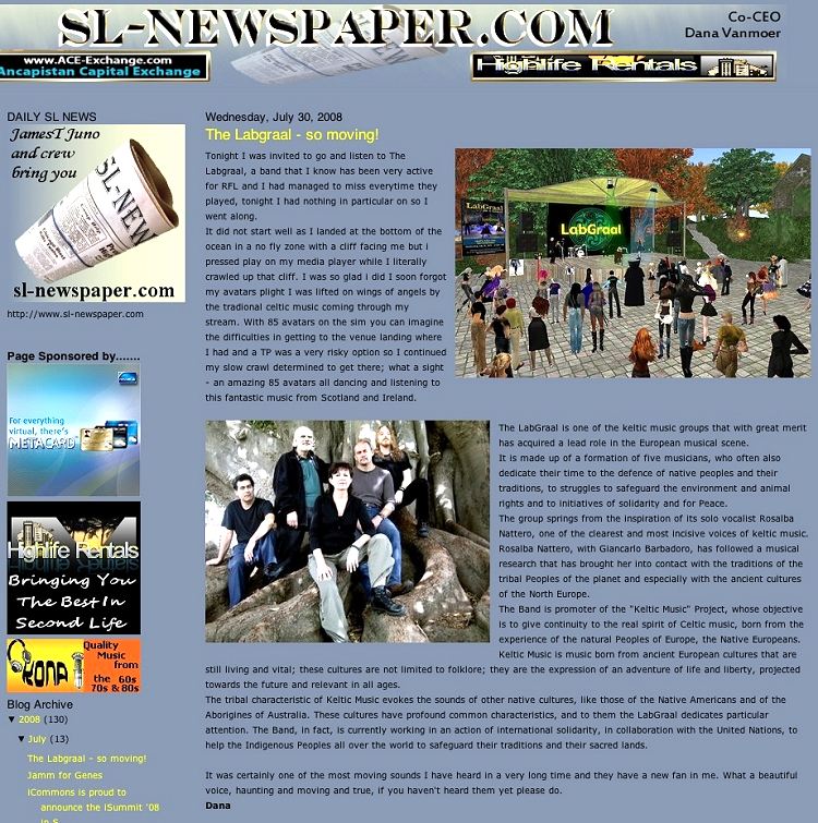 Il concerto era per beneficenza in favore di SOS Gaia per l'assistenza agli animali abbandonati. Come per tutti i concerti del LabGraal, l'evento è stato seguito da una folta folla di Avatar entusiasti da tutto il mondo. Vedere il servizio nella Rassegna Stampa.