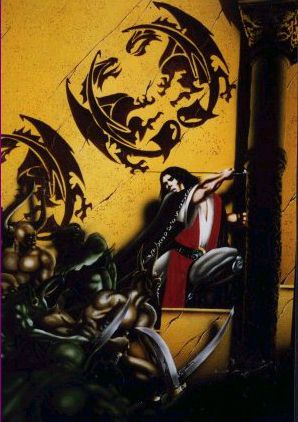 La sala che avrebbe dovuto essere il loro palcoscenico era diventata un campo di battaglia: altri due guerrieri Bedai, contorti e giganteschi, combattevano con furia assassina contro un drappello di guardie, mentre urla, fumo e rumori provenivano da ogni angolo del palazzo. Miriel e Dubric, immobili e con gli occhi chiusi, intessevano le loro litanie di forza, accanto a loro Silneus agitando le sue dita sottili emetteva arcani suoni che le dirigevano poi verso Hyede e verso i soldati impegnati nella battaglia.