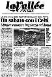 Vedere le cornamuse scozzesi sfilare per le vie di Aosta non e' spettacolo di tutti i giorni. Per non perdersi l'occasione basta pero' uscire nella giornata di sabato tra le 9,30 e le 17 e si incontrera' il "Brigadoon Highlander Pipe Band" nella tradizionale divisa marciare suonando le sue tradizionali musiche. Si apre cosi' la seconda giornata del festival celtique voluto dalla Presidenza del Consiglio Valle per festeggiare l'anniversario dei decreti luogotenenziali ed organizzato dalla casa editrice Keltia.