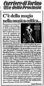 Rosalba Nattero, insieme con i membri del suo gruppo, si dedica da tempo alla riscoperta di quell'antico patrimonio che e' il bagaglio musicale della tradizione celtica. Nei suoi concerti si puo' seguire il percorso che collega tradizioni come quella bretone ad altre culture millenarie come quella scozzese, irlandese, ma anche arturiana o basca. E' evidente il legame tra queste culture, cosi' come e' lampante la magia che pervade la loro musica. La tradizione celtica lascia trapelare un messaggio che si rivolge alla sfera piu' intima dell'individuo, un messaggio che parla di evoluzione spirituale, di armonia, di amore per la terra e le sue creature. Un messaggio che evidentemente colpisce nel segno.Catia Bruzzo