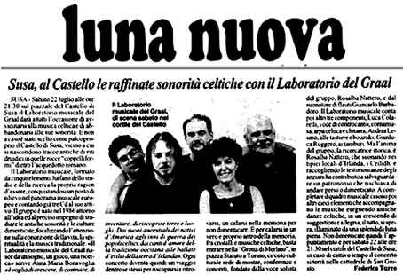 Il gruppo è nato nel 1986 attorno all’idea ed al preciso impegno di studiare le antiche sonorità e le culture dimenticate, focalizzando l’attenzione sulla concezione della vita, la spiritualità e la musica tradizionale. -Il Laboratorio musicale del Graal nasce da un sogno, un gioco, una ricerca- scrive Anna Maria Bonavoglia -è voglia di crescere, di costruire, di inventare, di ricostruire terre e luoghi. Dai suoni ancestrali dei nativi d’America agli inni di guerra dei popoli celtici, dai canti d’amore della tradizione occitana alle ballate d’esilio della terra d’Irlanda-. Ogni concerto diventa quindi un viaggio dentro se stessi per riscoprirsi e ritrovarsi, un calarsi nella memoria per non dimenticare. E per calarsi in un vero e proprio antro della memoria, fra cristalli e musiche celtiche, basta entrare nella “Grotta di Merlino” in Piazza Statuto a Torino, circolo culturale sede di mostre, conferenze e concerti, fondato dalla voce solista del gruppo, Rosalba Nattero, e dal suonatore di flauti Giancarlo Barbadoro. Il Laboratorio musicale conta poi altri tre componenti, Luca Colarelli, voce di controcanto, cornamusa, arpa celtica e chitarra ; Andrea Lesmo, alle tastiere e bouzouki ; Gianluca Roggero, ai tamburi. Ma l’anima del gruppo, la ricercatrice storica, è Rosalba Nattero, che suonando nei tipici locali d’Irlanda, i Ceilidh, e raccogliendo le testimonianze degli anziani ha contribuito a salvaguardare un patrimonio che rischiava di andar perso e dimenticato. A completare il quadro musicale ci sono poi altri dieci elementi che accompagnano le musiche eseguendo antiche danze celtiche, in un crescendo di suggestioni e allegria, il tutto, si spera, illuminato da una splendida luna piena. Non dimenticate quindi : l’appuntamento è per sabato 22 alle ore 21.30 nel cortile del Castello di Susa ; in caso di cattivo tempo il concerto si terrà nella cattedrale di San Giusto. Federica Turco “Luna Nuova”, 21 luglio 2000![]()
