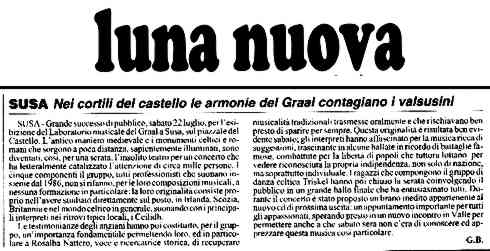 Le testimonianze degli anziani hanno poi costituito, per il gruppo, un’importanza fondamentale permettendo loro, ed in particolare a Rosalba Nattero, voce e ricercatrice storica, di recuperare musicalità trasmesse oralmente e che rischiavano ben presto di sparire per sempre. Questa originalità è risultata ben evidente sabato; gli interpreti hanno affascinato per la musica ricca di suggestioni, trascinante in alcune ballate in ricordo di battaglie famose, combattute per la libertà di popoli che tuttora lottano per vedere riconosciuta la loro indipendenza, non solo di nazione, ma soprattutto individuale. I ragazzi che compongono il gruppo di danza celtica Triskel hanno poi chiuso la serata coinvolgendo il pubblico in un grande ballo finale che ha entusiasmato tutti. Durante il concerto è stato proposto un brano inedito appartenente al nuovo cd di prossima uscita: un appuntamento importante per tutti gli appassionati, sperando presto in un nuovo incontro in Valle per permettere anche a chi sabato sera non c’era di conoscere ed apprezzare questa musica così particolare.“Luna Nuova”, 28 luglio 2000