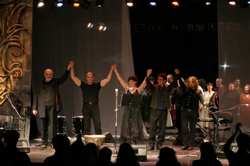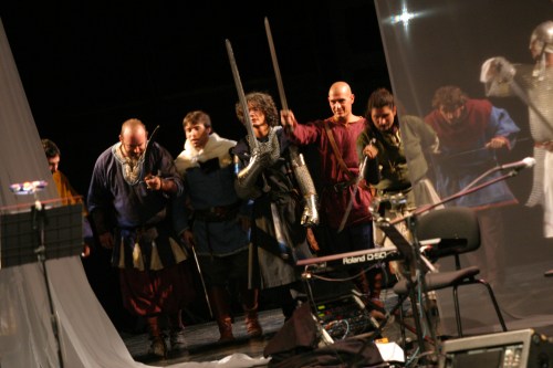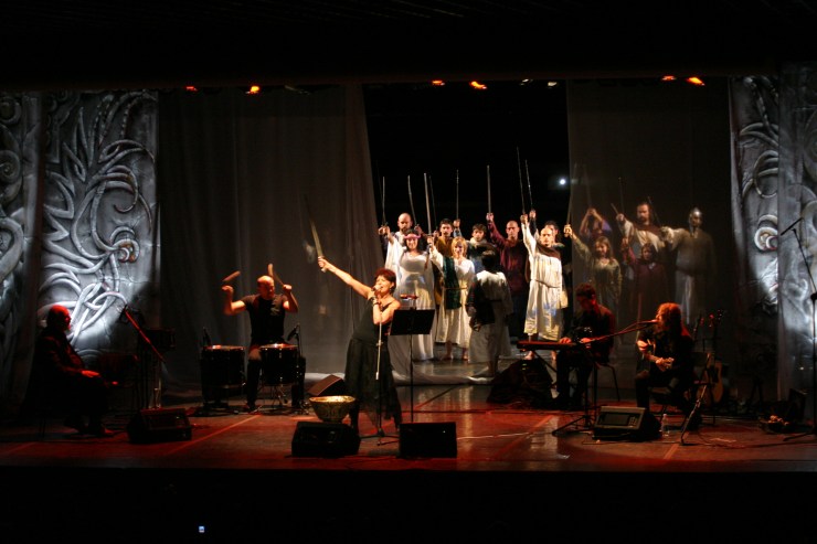 Un momento del concerto con la rappresentazione degli attori sullo sfondo
