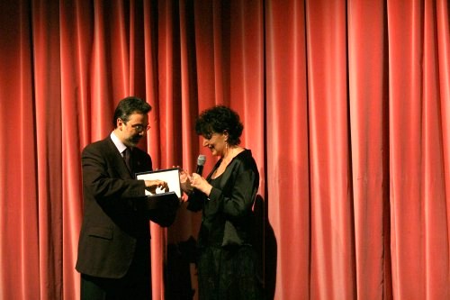 Giampiero Leo dopo aver presentato lo spettacolo consegna a Rosalba Nattero