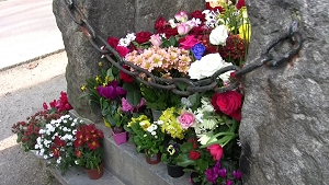 frequentata di tutto il cimitero. Non ho mai visto una tomba così fiorita: centinaia di fiori freschissimi circondano il dolmen da tutti i lati, segno che ogni giorno almeno decine di persone si recano lì.
