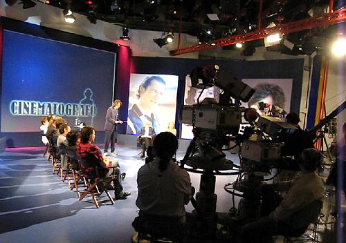 Lo studio di Rai 1 dove si svolge la registrazione della trasmissione televisiva "Cinematografo" condotta da Gigi Marzullo. Partecipano vari ospiti del mondo del cinema e i critici cinematografici Gianluigi Rondi, Anselma Dell'Olio, Gregorio Napoli e Mario Sesti. |