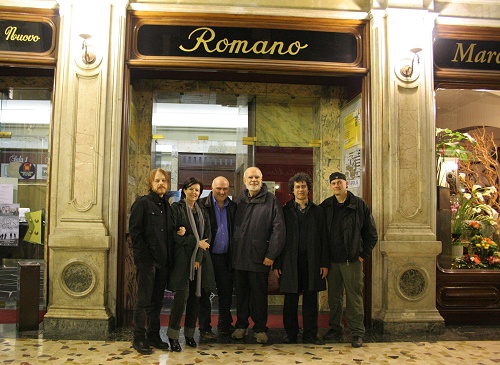 I protagonisti davanti al cinema Romano insieme con Giuseppe D'Amico della casa distributrice R.Ven. |